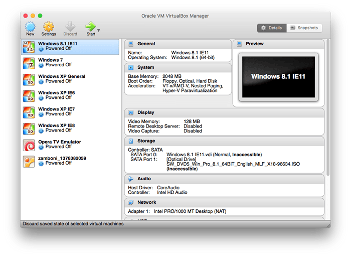 Avoir plusieurs machines virtuelles est très utile, particulièrement pour les test IE/Edge sur Windows — sur Windows, vous n'êtes pas autorisé à avoir de multiples versions du navigateur par défaut installé, donc vous pouvez vous construire une librairie de machines virtuelles afin de gérer les différents tests requis, par ex. :